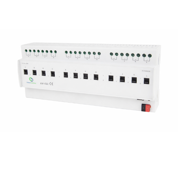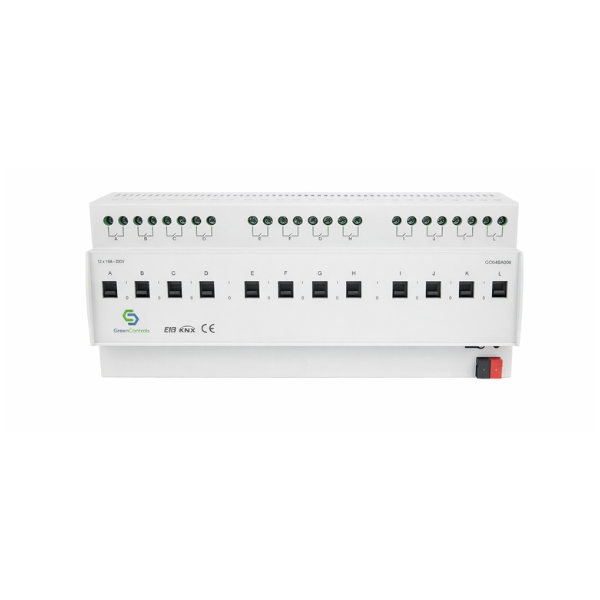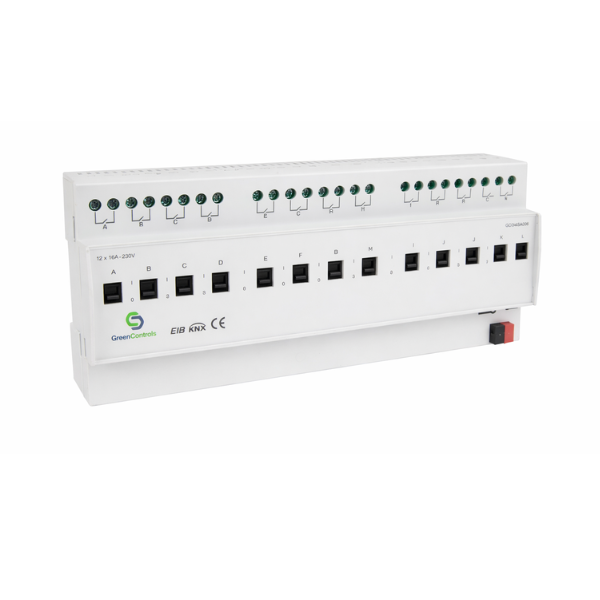 The GreenControls Switching Actuator, 12 Channel, 20A with Current Detection is a high-capacity KNX-certified device designed for professional automation projects that demand robust load control and monitoring. Installed on a 35mm DIN rail, it provides twelve independent outputs, each capable of switching resistive loads up to 20A at 230VAC or 24VDC, making it the perfect solution for large-scale lighting, HVAC, and power distribution applications in smart buildings.